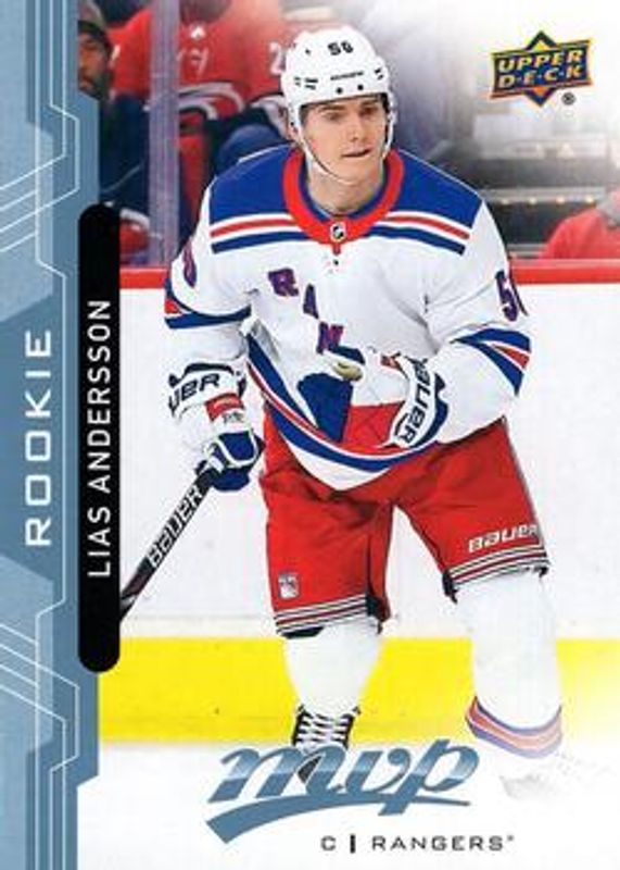The Lias Andersson 2018 Upper Deck MVP #246 Factory Set Blue Rookie card is 1 of 17 Lias Andersson's card variations in the 2018 Upper Deck MVP set being tracked by Sports Card Investor, including Base, Green Script, Silver Script, Gold Script /150, and Super Script /25.