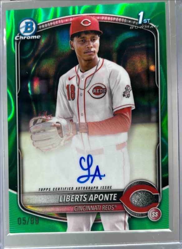 The Liberts Aponte 2025 Bowman Chrome #CPA-LA Prospect Auto - Green Lava Refractor /99 (1st) card in Raw condition has moved up $3.26 (+12.2%) in the last 30 days and was last sold for $29.99 .