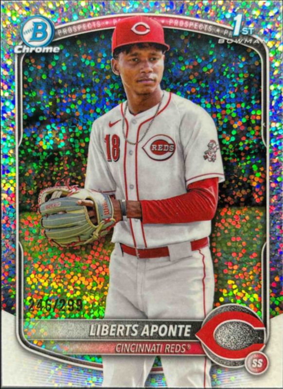 This card is 1 of 88 Liberts Aponte's card variations in the 2025 Bowman Chrome set being tracked by Sports Card Investor, including International Refractor Variation, Prospect Auto (1st), Prospect Auto - Black & White Shimmer Refractor (1st), Prospects (1st), and Prospects - Mini-Diamond Refractor (1st).