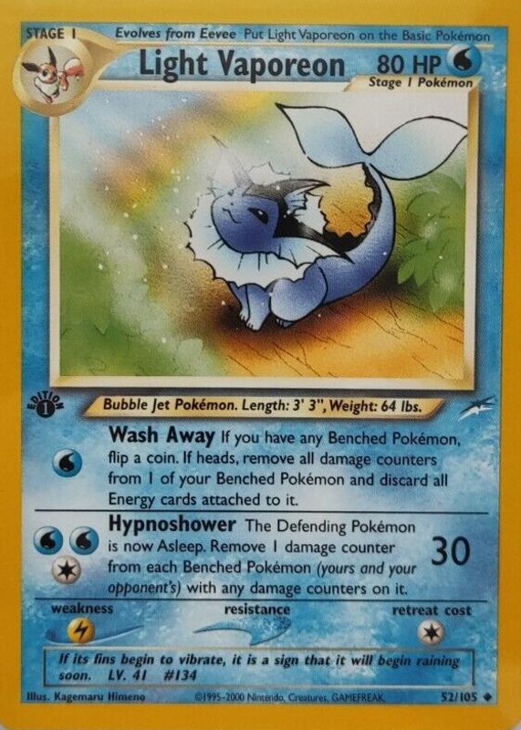 The Light Vaporeon 2002 Neo Destiny #52/105 1st Edition card in Raw TCG (Near Mint) condition has not changed in price in the last 30 days and was last sold for $36.50 .