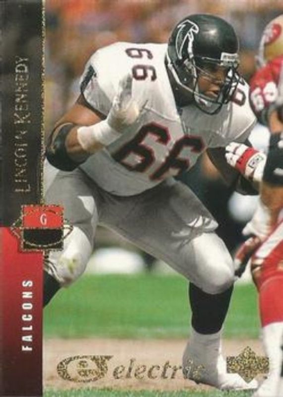 The Lincoln Kennedy 1994 Upper Deck #212 Electric Gold card is 1 of 3 Lincoln Kennedy's card variations in the 1994 Upper Deck set being tracked by Sports Card Investor, including Base, and Electric.