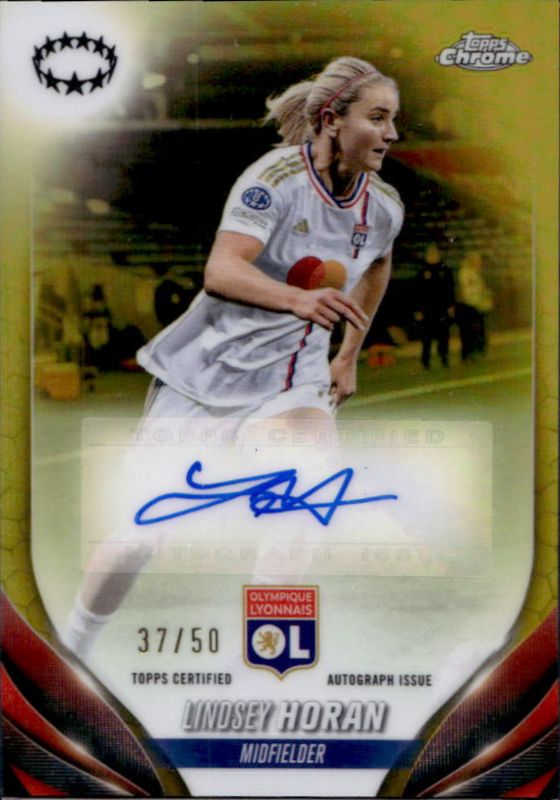 The Lindsey Horan 2023 Topps Chrome UEFA Women's Champions League #A-LH Autographs - Gold /50 Rookie card is 1 of 33 Lindsey Horan's card variations in the 2023 Topps Chrome UEFA Women's Champions League set being tracked by Sports Card Investor, including Base, Aqua Prism, Pulsar, Refractor, and XI.