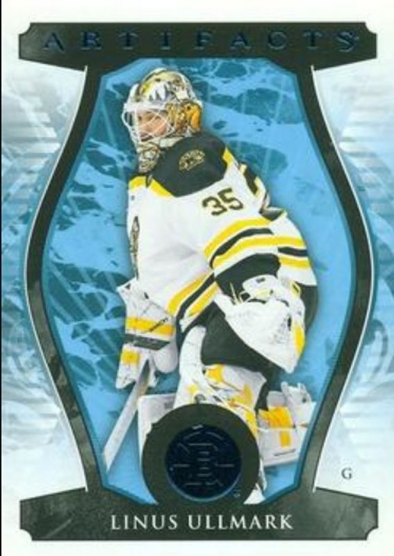 The Linus Ullmark 2023 Upper Deck Artifacts #139 Turquoise card is 1 of 19 Linus Ullmark's card variations in the 2023 Upper Deck Artifacts set being tracked by Sports Card Investor, including Base /999, Leather, Plexi, Wood, and Ruby /499.