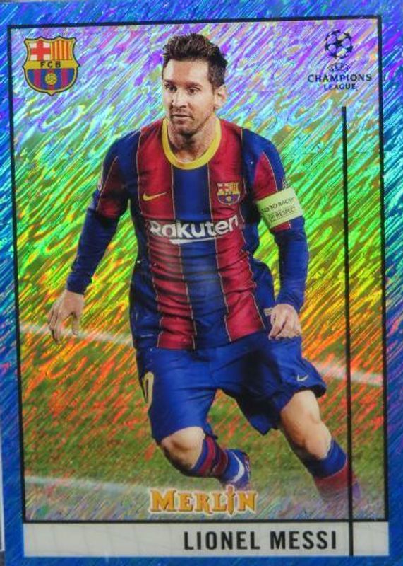 Best Prices Available For Sale of Lionel Messi 2020 Topps Merlin Chrome UEFA Champions League #1 Blue Shimmer Refractor /75