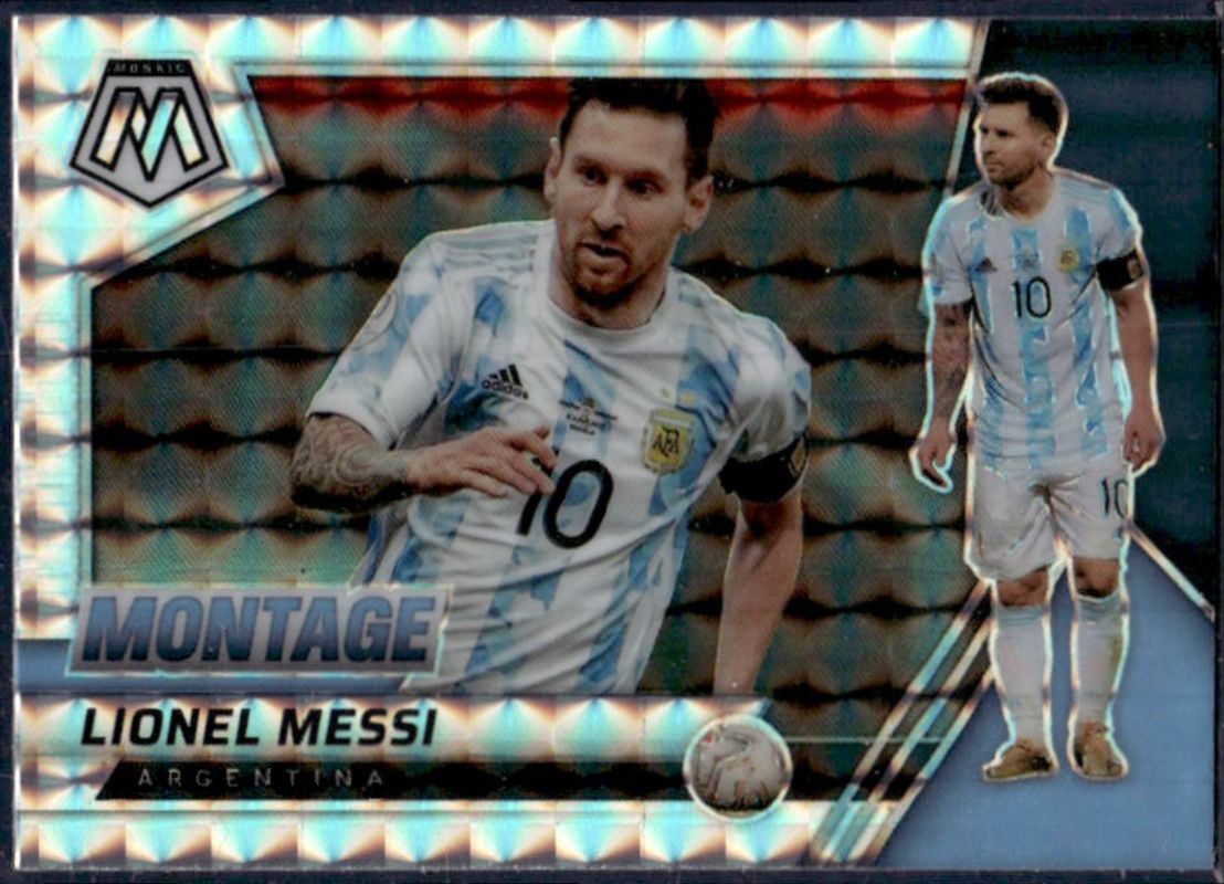 The Lionel Messi 2021 Mosaic Road to FIFA World Cup #10 Montage card is 1 of 37 Lionel Messi's card variations in the 2021 Mosaic Road to FIFA World Cup set being tracked by Sports Card Investor, including Base, Blue Pulsar, Choice Red & Green, Gold Pulsar, and Reactive Blue.