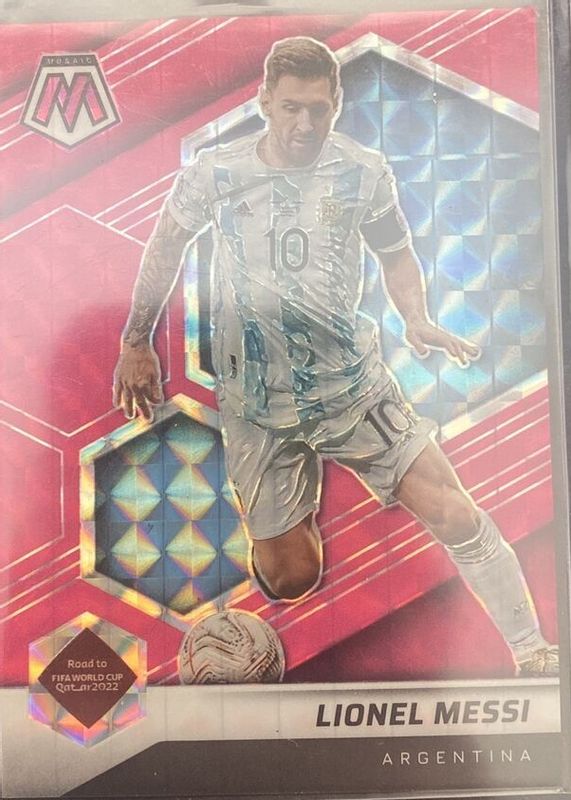 The Lionel Messi 2021 Mosaic Road to FIFA World Cup #10 Pink Fluorescent /10 card in Raw condition has not changed in price in the last 30 days and was last sold for $500.00 .