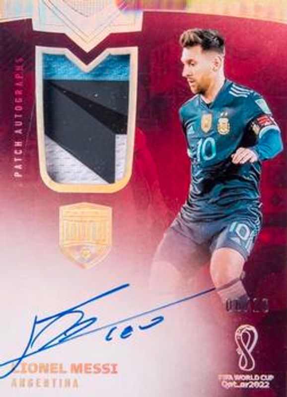 The Lionel Messi 2022 Eminence FIFA World Cup #PA-LEO Patch Autographs /10 card is 1 of 48 Lionel Messi's card variations in the 2022 Eminence FIFA World Cup set being tracked by Sports Card Investor, including Base /10, Gold /5, Platinum /1, Banner Signatures /10, and Crown Jewels /10.