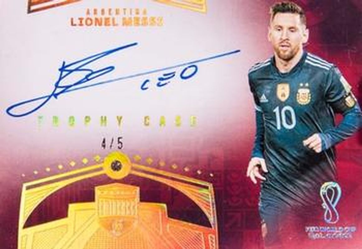 The Lionel Messi 2022 Eminence FIFA World Cup #TC-LEO Trophy Case - Gold /5 card is 1 of 48 Lionel Messi's card variations in the 2022 Eminence FIFA World Cup set being tracked by Sports Card Investor, including Base /10, Gold /5, Platinum /1, Banner Signatures /10, and Crown Jewels /10.