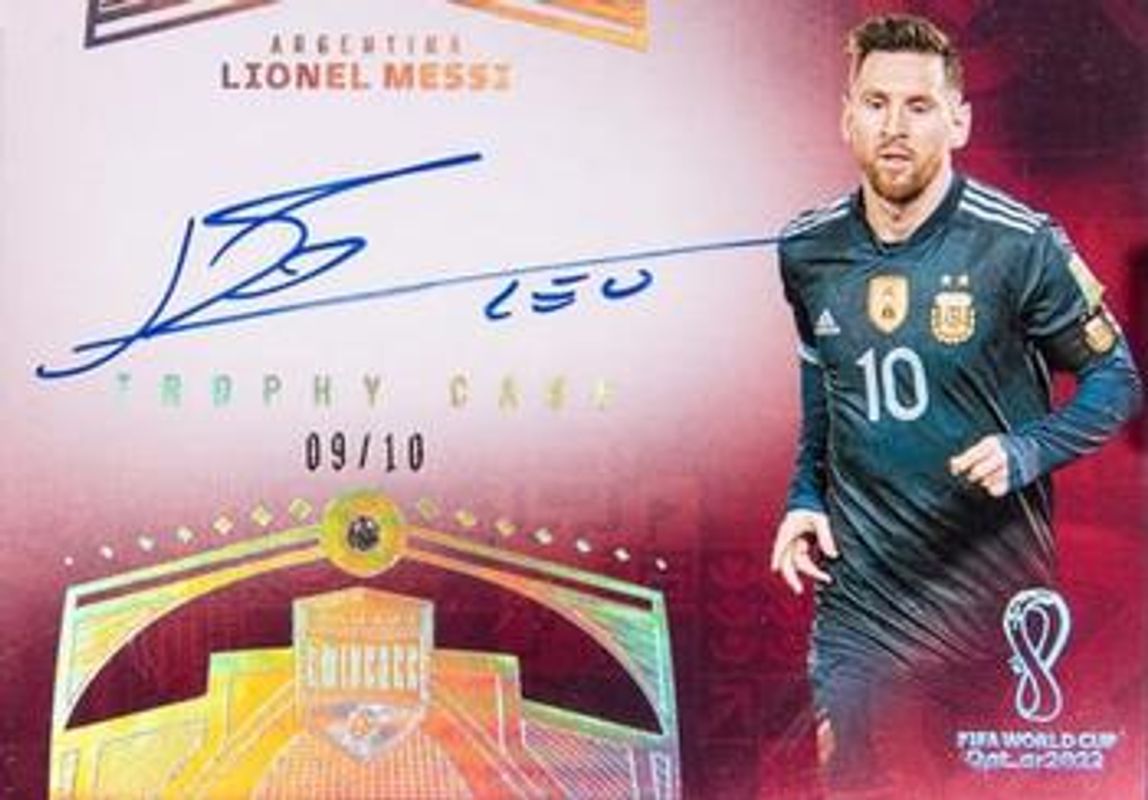 The Lionel Messi 2022 Eminence FIFA World Cup #TC-LEO Trophy Case /10 card is 1 of 48 Lionel Messi's card variations in the 2022 Eminence FIFA World Cup set being tracked by Sports Card Investor, including Base /10, Gold /5, Platinum /1, Banner Signatures /10, and Crown Jewels /10.