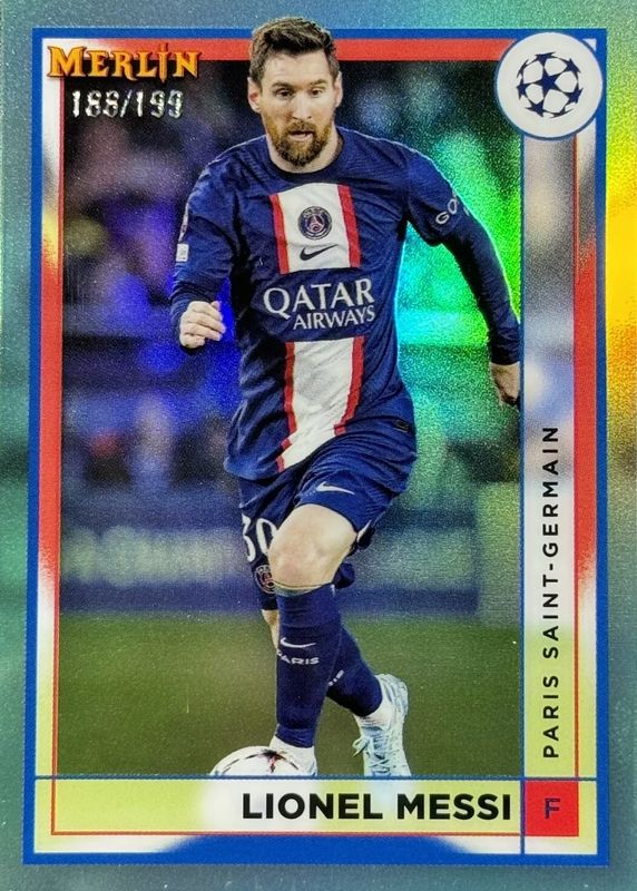 This card is 1 of 19 Lionel Messi's card variations in the 2022 Topps Merlin Chrome UEFA Club Competitions set being tracked by Sports Card Investor, including Neon Green Shimmer Refractor /350, Rose Gold Shimmer Refractor /299, Pink Mojo Refractor /275, Atomic Refractor /250, and Speckle Refractor /150.