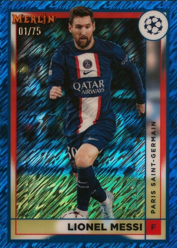 Best Prices Available For Sale of Lionel Messi 2022 Topps Merlin Chrome UEFA Club Competitions #104 Blue Shimmer Refractor /75