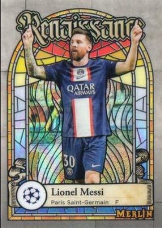 The Lionel Messi 2022 Topps Merlin Chrome UEFA Club Competitions #R-2 Renaissance card is 1 of 42 Lionel Messi's card variations in the 2022 Topps Merlin Chrome UEFA Club Competitions set being tracked by Sports Card Investor, including Base, Aqua Prism Refractor, Refractor, Vintage Merlin Refractor, and Neon Green Shimmer Refractor /350.