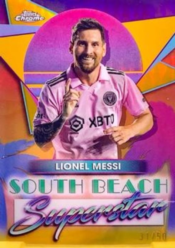 The Lionel Messi 2024 Topps Chrome MLS #SB-7 South Beach Superstar - Gold Refractor /50 card is 1 of 141 Lionel Messi's card variations in the 2024 Topps Chrome MLS set being tracked by Sports Card Investor, including #10b Base, #10 Base, #10 Aqua Lava Refractor, #10 Gold Lava Refractor, and #10 Neon Green Lava Refractor.