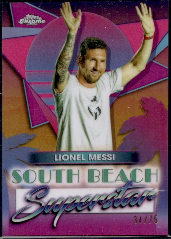 The Lionel Messi 2024 Topps Chrome MLS #SB-1 South Beach Superstar Pink - Refractor /75 card is 1 of 141 Lionel Messi's card variations in the 2024 Topps Chrome MLS set being tracked by Sports Card Investor, including #10b Base, #10 Base, #10 Aqua Lava Refractor, #10 Gold Lava Refractor, and #10 Neon Green Lava Refractor.