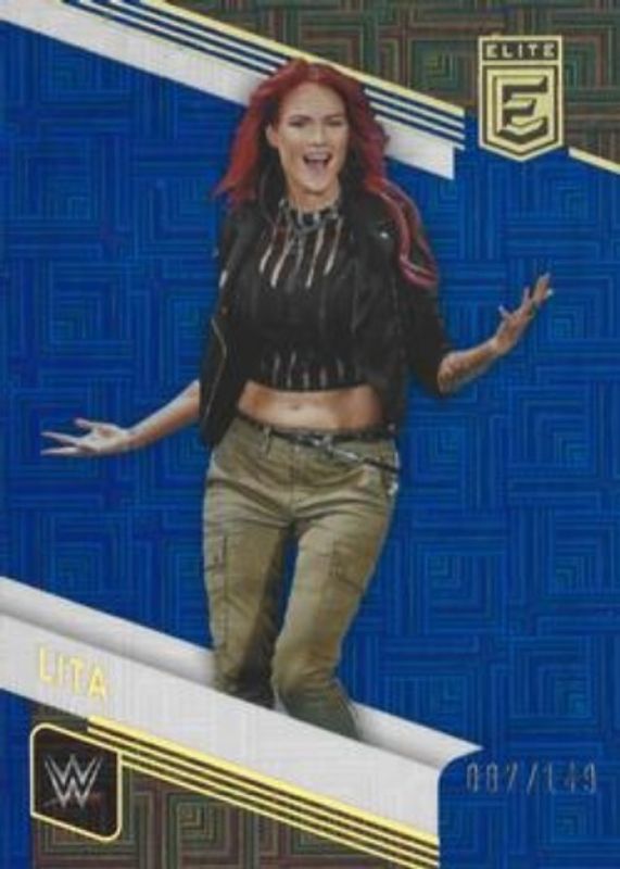 The Lita 2023 Elite WWE #149 Blue /149 card is 1 of 52 Lita's card variations in the 2023 Elite WWE set being tracked by Sports Card Investor, including Base, Green, Pink, Razzle Dazzle, and Red.