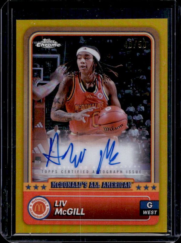 The Liv McGill 2024 Topps Chrome McDonald's All-American #19 Base Autographs - Gold Refractor /50 card is 1 of 93 Liv McGill's card variations in the 2024 Topps Chrome McDonald's All-American set being tracked by Sports Card Investor, including #19 Base, #69 Base, #19 Blue RayWave Refractor, #69 Blue RayWave Refractor, and #19 McDonald's Logo Refractor.