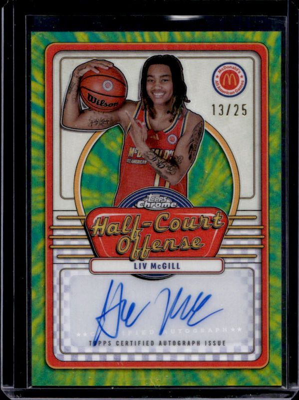 The Liv McGill 2024 Topps Chrome McDonald's All-American #IML-ALI Half-Court Signatures - Tie-Dye Refractor /25 card is 1 of 93 Liv McGill's card variations in the 2024 Topps Chrome McDonald's All-American set being tracked by Sports Card Investor, including #19 Base, #69 Base, #19 Blue RayWave Refractor, #69 Blue RayWave Refractor, and #19 McDonald's Logo Refractor.
