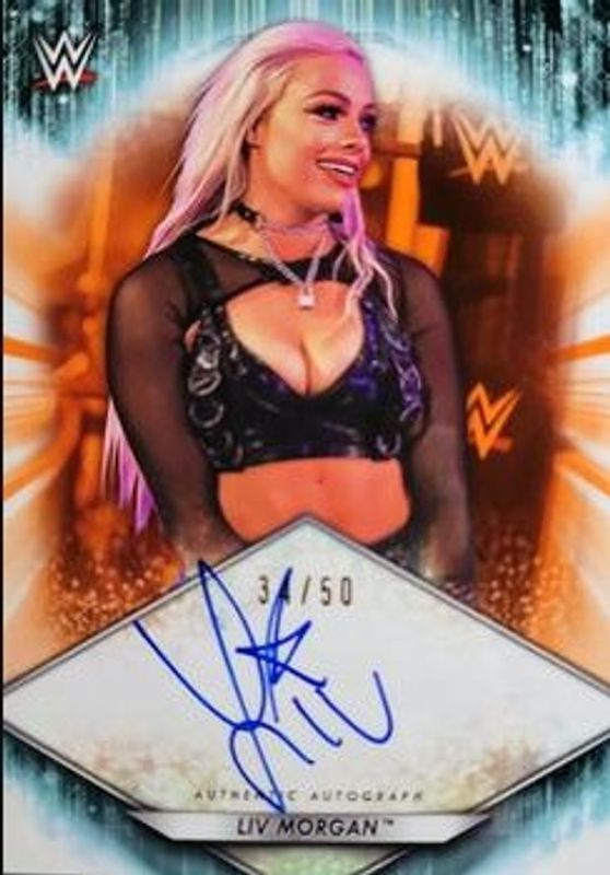 The Liv Morgan 2021 Topps WWE #A-LM Autographs - Orange /50 card is 1 of 34 Liv Morgan's card variations in the 2021 Topps WWE set being tracked by Sports Card Investor, including Base, Bronze, Foilboard, Aqua /299, and Dark Green /99.