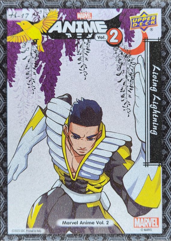 The Living Lightning 2023 Upper Deck Marvel Anime Vol. 2 #H-17 Hanafuda card is 1 of 5 Living Lightning's card variations in the 2023 Upper Deck Marvel Anime Vol. 2 set being tracked by Sports Card Investor, including Base, Color Spiral, Japanese Mega Moon, and Thatched Foil.