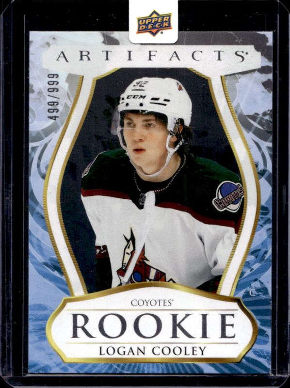 The Logan Cooley 2023 Upper Deck Artifacts #202 Base /999 Rookie card is 1 of 16 Logan Cooley's card variations in the 2023 Upper Deck Artifacts set being tracked by Sports Card Investor, including Emerald /99, Retro Rookies Redemptions /999, Rookie Redemptions /999, Horizontal Photo Variants Redemptions /499, and Material Gold Redemption /399.