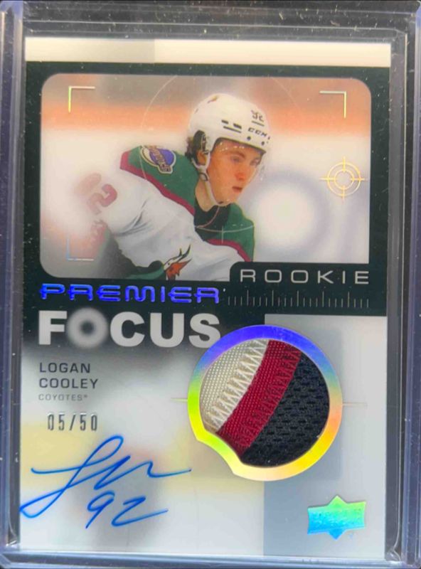 The Logan Cooley 2023 Upper Deck Premier #PFR-CO Premier Focus Auto Patch Rookies /50 card is 1 of 41 Logan Cooley's card variations in the 2023 Upper Deck Premier set being tracked by Sports Card Investor, including Base /399, Bronze /199, Gold /65, Ruby /49, and Rose Gold /25.