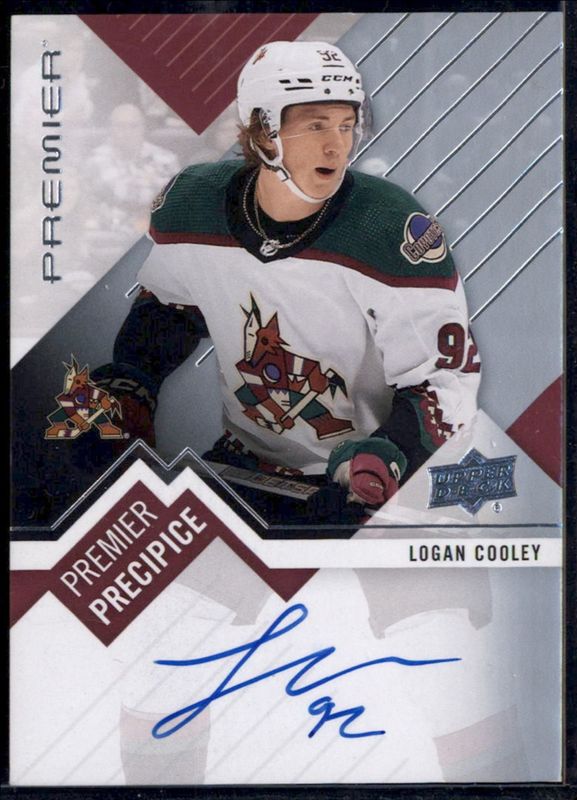 The Logan Cooley 2023 Upper Deck Premier #PPR-CO Premier Precipice Auto Rookies card is 1 of 41 Logan Cooley's card variations in the 2023 Upper Deck Premier set being tracked by Sports Card Investor, including Base /399, Bronze /199, Gold /65, Ruby /49, and Rose Gold /25.