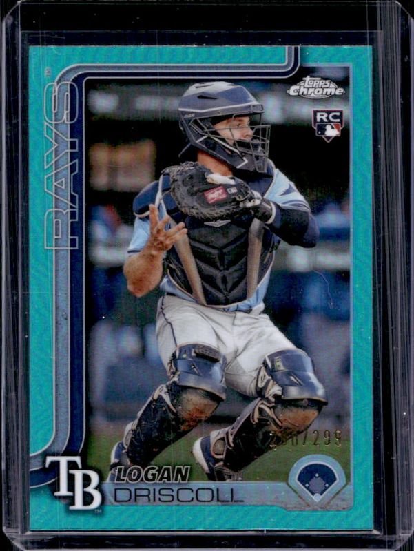 The Logan Driscoll 2025 Topps Chrome #185 Teal Refractor /299 Rookie card is 1 of 72 Logan Driscoll's card variations in the 2025 Topps Chrome set being tracked by Sports Card Investor, including Base, Geometric Refractor, Lightboard Logo Variation, Negative Refractor, and Prism Refractor.