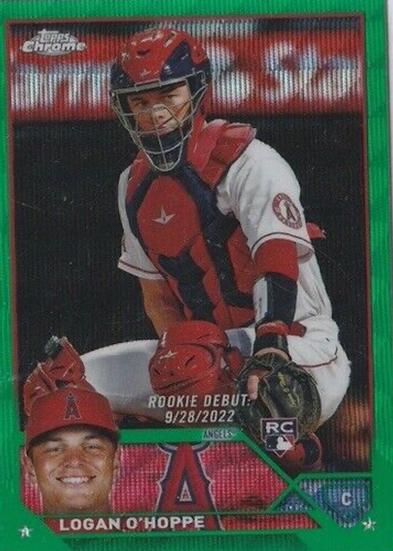 The Logan O'Hoppe 2023 Topps Chrome Update #USC62 Rookie Debut - Green Wave Refractor /99 card in Raw condition has not changed in price in the last 30 days and was last sold for $5.00 .