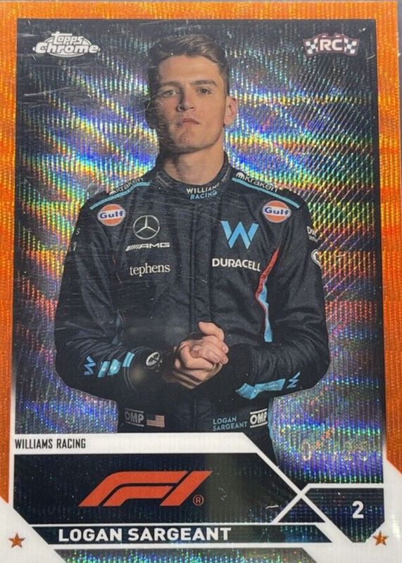 The Logan Sargeant 2023 Topps Chrome Formula 1 #64 Orange Wave Refractor /25 Rookie card in Raw condition has not changed in price in the last 30 days and was last sold for $26.00 .