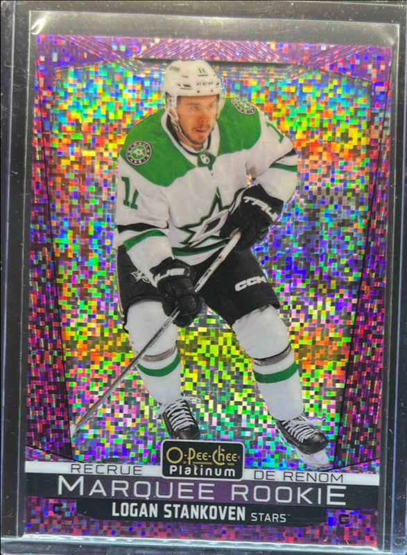 The Logan Stankoven 2024 O-Pee-Chee #P-LS 2024-25 OPC Platinum Previews - Violet Pixels /99 Rookie card is 1 of 39 Logan Stankoven's card variations in the 2024 O-Pee-Chee set being tracked by Sports Card Investor, including Base, Blue Border, Red Border, Yellow Border, and Rainbow /350.
