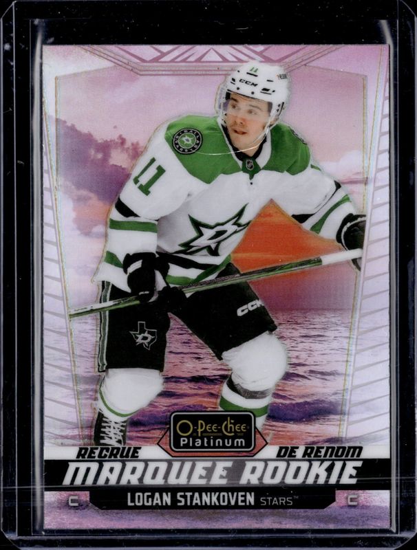 The Logan Stankoven 2024 O-Pee-Chee Platinum #202 Sunset Rookie card is 1 of 45 Logan Stankoven's card variations in the 2024 O-Pee-Chee Platinum set being tracked by Sports Card Investor, including Base, Neon Yellow Surge, Pink Magma, Rainbow, and Violet Pixels /299.