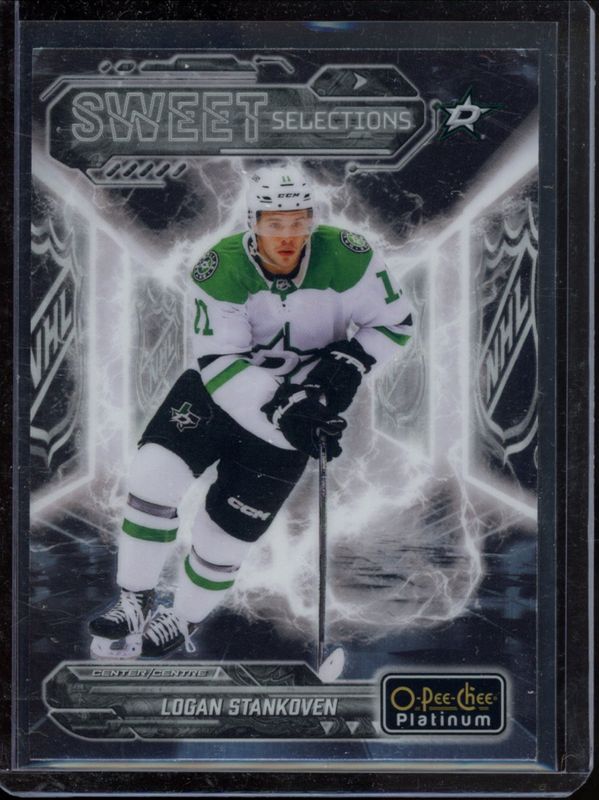 The Logan Stankoven 2024 O-Pee-Chee Platinum #SS-10 Sweet Selections Rookie card is 1 of 45 Logan Stankoven's card variations in the 2024 O-Pee-Chee Platinum set being tracked by Sports Card Investor, including Base, Neon Yellow Surge, Pink Magma, Rainbow, and Sunset.