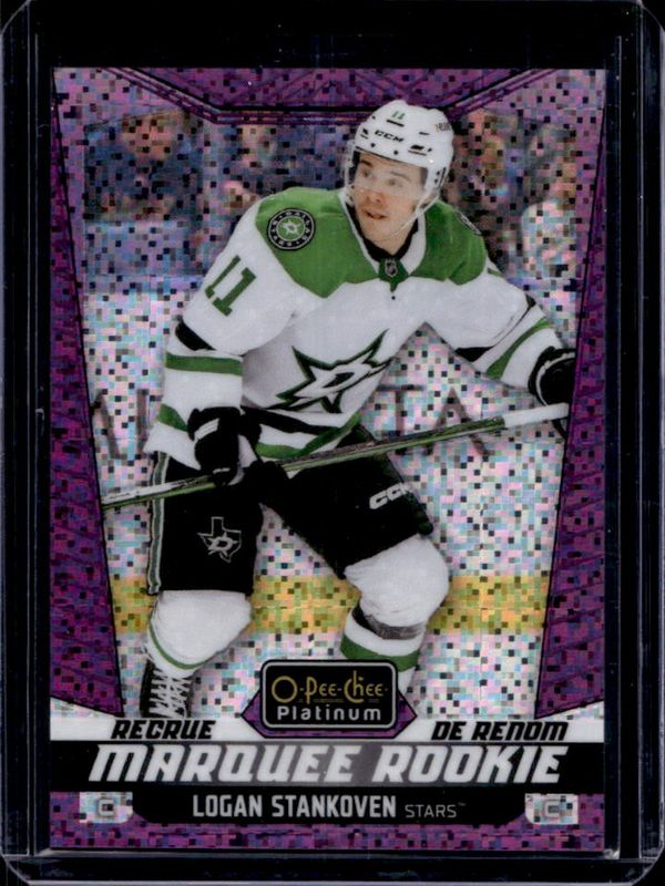 The Logan Stankoven 2024 O-Pee-Chee Platinum #202 Violet Pixels /299 Rookie card is 1 of 45 Logan Stankoven's card variations in the 2024 O-Pee-Chee Platinum set being tracked by Sports Card Investor, including Base, Neon Yellow Surge, Pink Magma, Rainbow, and Sunset.