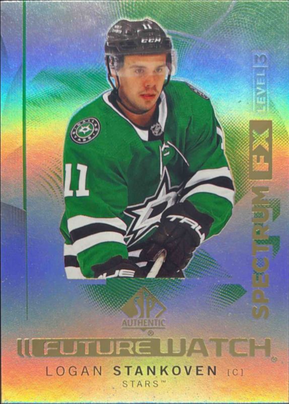 The Logan Stankoven 2024 SP Authentic #S-85 Spectrum FX Rookie card is 1 of 45 Logan Stankoven's card variations in the 2024 SP Authentic set being tracked by Sports Card Investor, including Base /999, Auto Mystery Black, Future Watch Acetate, Limited Red, and Limited Blue /399.