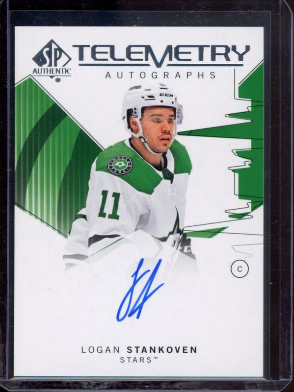 The Logan Stankoven 2024 SP Authentic #T-LS Telemetry Autographs Rookie card is 1 of 45 Logan Stankoven's card variations in the 2024 SP Authentic set being tracked by Sports Card Investor, including Base /999, Auto Mystery Black, Future Watch Acetate, Limited Red, and Limited Blue /399.