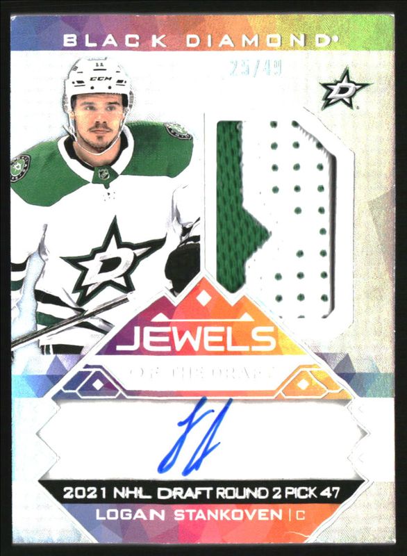 The Logan Stankoven 2024 Upper Deck Black Diamond #JD-LS Jewels of the Draft Rookies /99 card is 1 of 68 Logan Stankoven's card variations in the 2024 Upper Deck Black Diamond set being tracked by Sports Card Investor, including Base /349, Diamond Relic Rookies /99, Premium Relics /50, Autographs /49, and Diamond Relic Rookies Emerald /10.