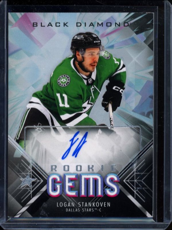The Logan Stankoven 2024 Upper Deck Black Diamond #RGS-LS Rookie Gems Signatures /199 card is 1 of 68 Logan Stankoven's card variations in the 2024 Upper Deck Black Diamond set being tracked by Sports Card Investor, including Base /349, Diamond Relic Rookies /99, Premium Relics /50, Autographs /49, and Diamond Relic Rookies Emerald /10.