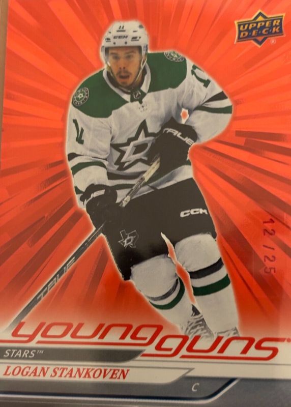 This card is 1 of 8 Logan Stankoven's card variations in the 2024 Upper Deck set being tracked by Sports Card Investor, including Young Guns Base, Young Guns - Clear Cut, Young Guns - Outburst Silver, Young Guns - Deluxe /250, and Young Guns - UD Exclusives /100.