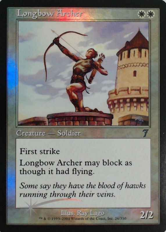 The Longbow Archer 2001 Seventh Edition #26 Foil card in Raw TCG (Lightly Played) condition has not changed in price in the last 30 days and was last sold for $6.64 .