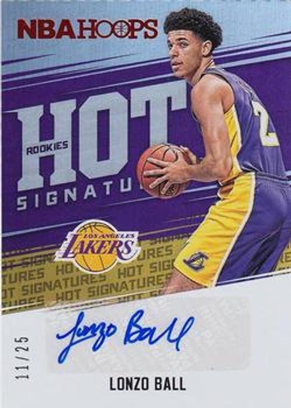The Lonzo Ball 2017 Hoops #HSR-LB Red Hot Signatures Rookies /25 card is 1 of 32 Lonzo Ball's card variations in the 2017 Hoops set being tracked by Sports Card Investor, including #252 Base, Base, #252 Premium Factory Set /199, #252 Blue, and #2 Class of 2017.