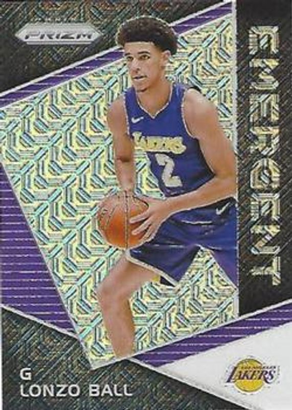 The Lonzo Ball 2017 Prizm #EM-LON Emergent - Mojo /25 Rookie card is 1 of 54 Lonzo Ball's card variations in the 2017 Prizm set being tracked by Sports Card Investor, including Base, Fast Break, Green, Hyper, and Red White Blue.