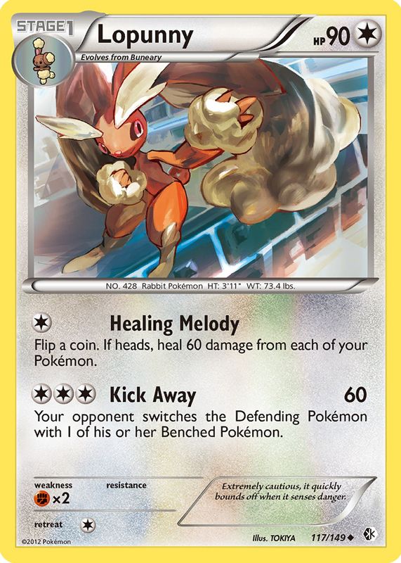 The Lopunny 2012 Black & White: Boundaries Crossed #117/149 Base card in Raw TCG (Lightly Played) condition has not changed in price in the last 30 days and was last sold for $1.99 .