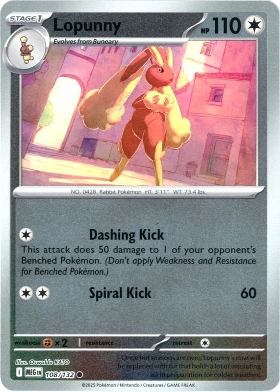 The Lopunny 2025 Mega Evolution #108/132 Reverse Holo card in Raw TCG (Near Mint) condition has moved down -$0.50 (-33.3%) in the last 30 days and was last sold for $1.00 .