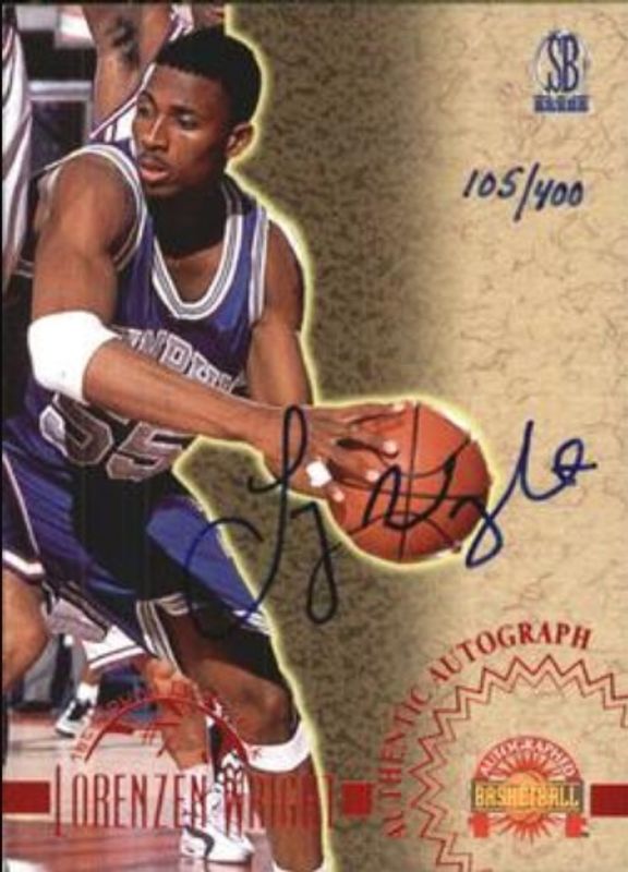 The Lorenzen Wright 1996 Score Board Autographed Autographs - Red /400 Rookie card is 1 of 6 Lorenzen Wright's card variations in the 1996 Score Board Autographed set being tracked by Sports Card Investor, including Base, Autographs, Pure Performance, Pure Performance - Gold, and Autographs - Silver /325.