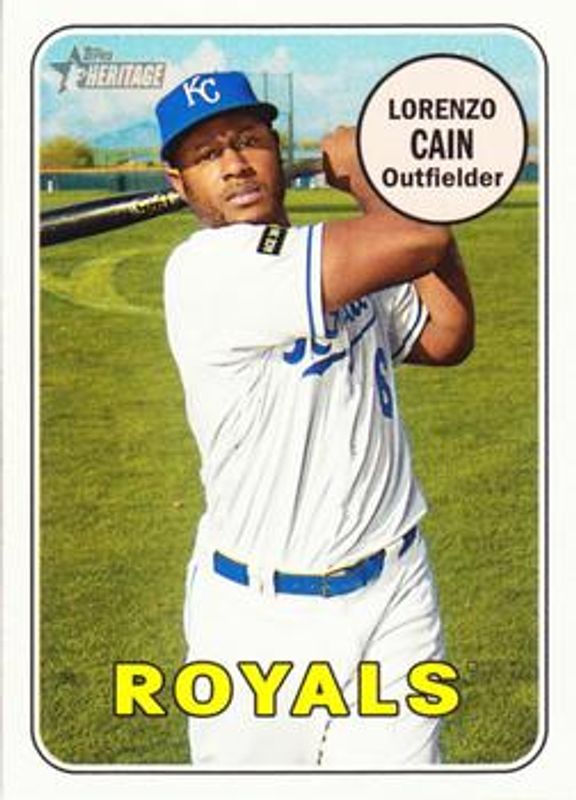 The Lorenzo Cain 2018 Topps Heritage #428 Base card is 1 of 22 Lorenzo Cain's card variations in the 2018 Topps Heritage set being tracked by Sports Card Investor, including #706c Base, #706b Base, #706 Base, #428 100th Anniversary, and #706 Black Border.