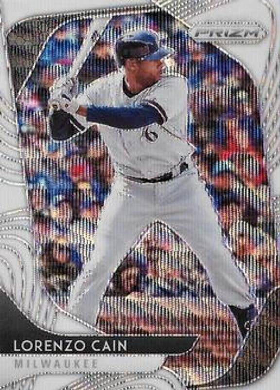 The Lorenzo Cain 2020 Prizm #32 White Wave card is 1 of 37 Lorenzo Cain's card variations in the 2020 Prizm set being tracked by Sports Card Investor, including Base, Blue, Carolina Blue, Cosmic Haze, and Green.