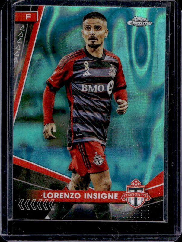The Lorenzo Insigne 2024 Topps Chrome MLS #134 Aqua Lava Refractor card is 1 of 51 Lorenzo Insigne's card variations in the 2024 Topps Chrome MLS set being tracked by Sports Card Investor, including Base, Gold Lava Refractor, Neon Green Lava Refractor, Prism Refractor, and Refractor.