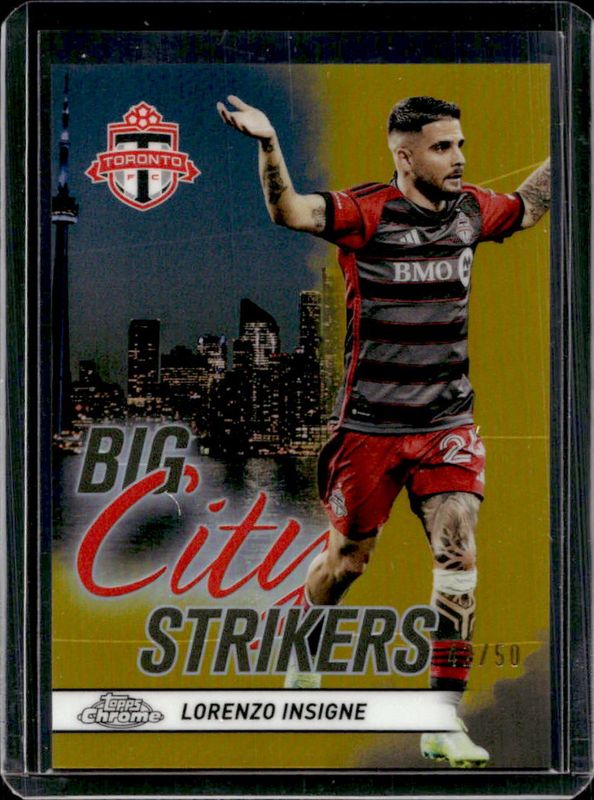 The Lorenzo Insigne 2024 Topps Chrome MLS #CS-2 Big City Strikers - Gold Refractor /50 card is 1 of 51 Lorenzo Insigne's card variations in the 2024 Topps Chrome MLS set being tracked by Sports Card Investor, including Base, Aqua Lava Refractor, Gold Lava Refractor, Neon Green Lava Refractor, and Prism Refractor.