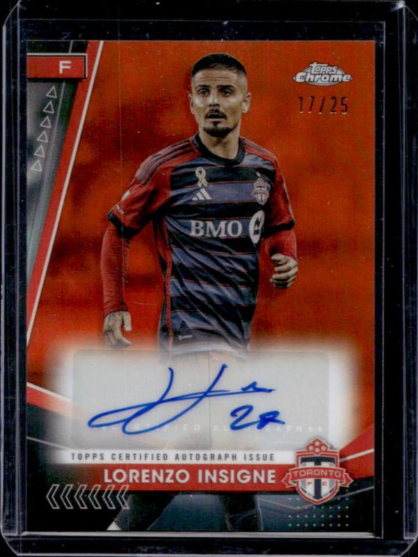 The Lorenzo Insigne 2024 Topps Chrome MLS #CA-LI Chrome Autographs - Orange Refractor /25 card is 1 of 51 Lorenzo Insigne's card variations in the 2024 Topps Chrome MLS set being tracked by Sports Card Investor, including Base, Aqua Lava Refractor, Gold Lava Refractor, Neon Green Lava Refractor, and Prism Refractor.