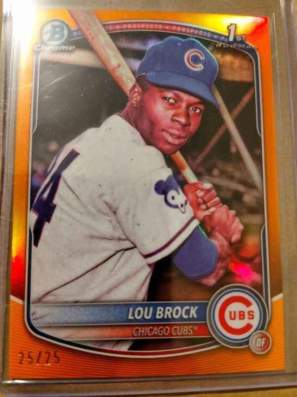 The Lou Brock 2025 Bowman Draft #BD-202 Chrome Retrofractor Variation - Orange Refractor /25 (1st) card in Raw condition has not changed in price in the last 30 days and was last sold for $115.25 .